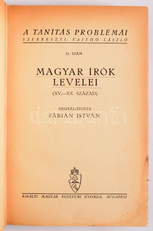 Magyar írók levelei. (XV.-XX. század.) Összeállította: Fábián István. A tanítás problémái 21. Bp.,1938, Kir. Magyar Egyetemi Nyomda. Kiadói félvászon-kötés, kissé kopottas