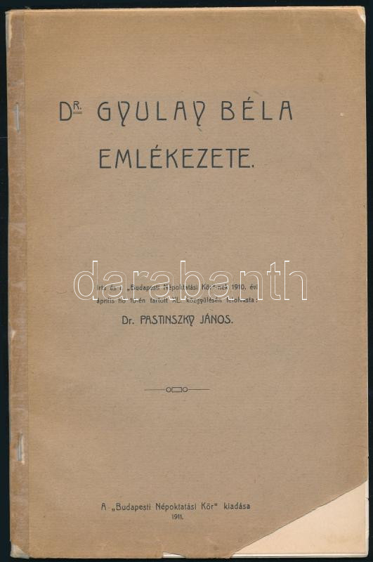Pastinszky János: Dr. Gyulay Béla emlékezete. Írta és a "Budapesti Népoktatási Kör"-nek 1910. évi április hó 10-én tartott XL. közgyűlésén felolvasta: Dr Pastinszky János. Bp., 1911., "Budapesti Népoktatási Kör". Sérült kiadói papírkötés, ragasztással a gerincén