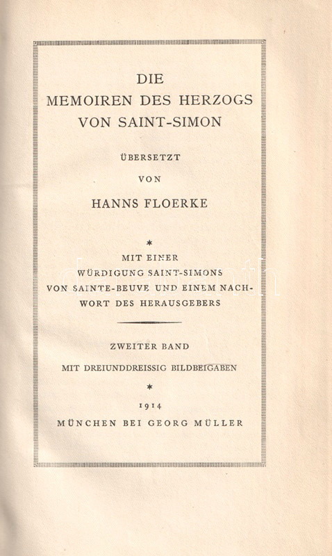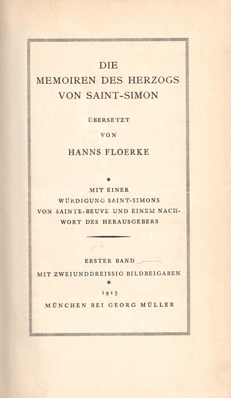 Die Memoiren des Herzogs von Saint-Simon. Übersetzt von Hanns Floerke. Mit einer Würdigung Saint-Simons von Sainte-Beuve und einem Nachwort des Herausgebers. Band I-II. [Két kötetbe kötve.]