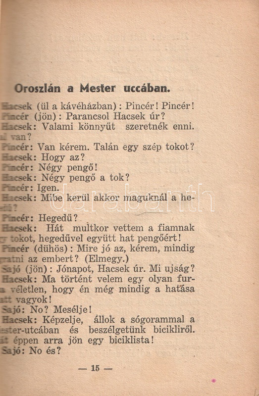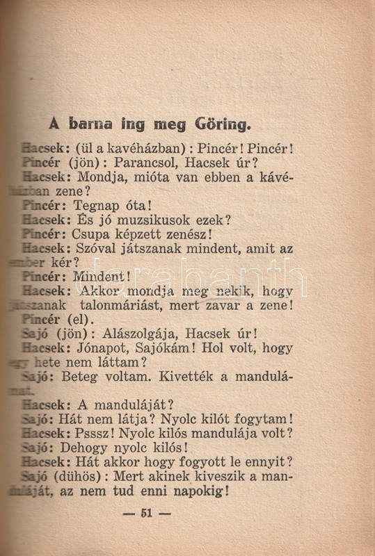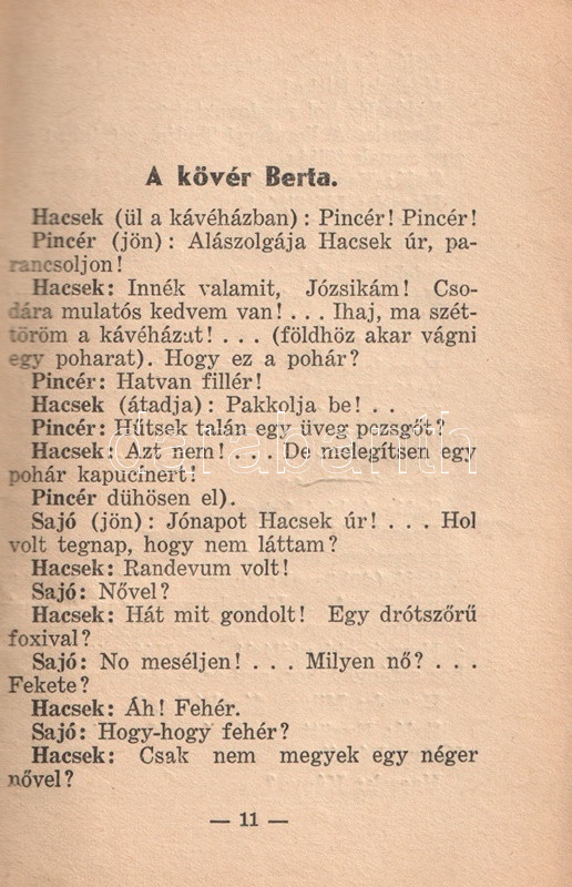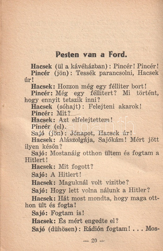 Vadnai [született Wolf] László (1904-1967) újságÃró, humorista, konferanszié; a kávéházi jól értesült figurák, azaz Hacsek és Sajó alakjának kitalálója. A szerzÅ‘ ezernél is több, humorosnak szánt rövid jelenetet Ãrt a két harsány vitatkozó szerepeltetésével. Kötetünk friss válogatást mutat be a termésbÅ‘l. Évszámadat feltüntetése nélkül kiadott kötetünk megjelenési évét 1933-ra becsüljük a jelenetekben elhangzó politikai és más természetű tények alapján: Hacsek és Sajó sarkos véleményt nyilvánÃt a sok beszédet mondó politikai aktorokról, HitlerrÅ‘l, Göring porosz (1933-1945), MacDonald angol (1929-1935), Gömbös magyar miniszterelnökrÅ‘l (1932-1936), Imrédy Béla pénzügyminiszterrÅ‘l (1932-1935), az olasz leszerelési konferenciákról, magyar szÃnészek hollywoodi karrierjérÅ‘l és Italo Balbo olasz repülÅ‘ amerikai útjáról (1933).