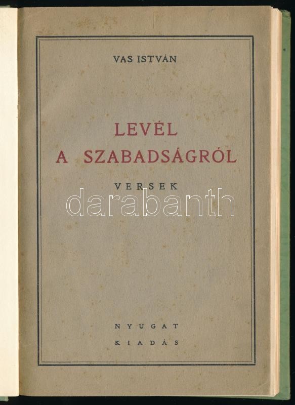 Vas István: Levél a szabadságról. Versek. 1. kiadás. A szerző második verseskötete. DEDIKÁLT! [Bp.,1935], Nyugat. Újrakötött kartonált kötés, bekötött eredeti borítóval.