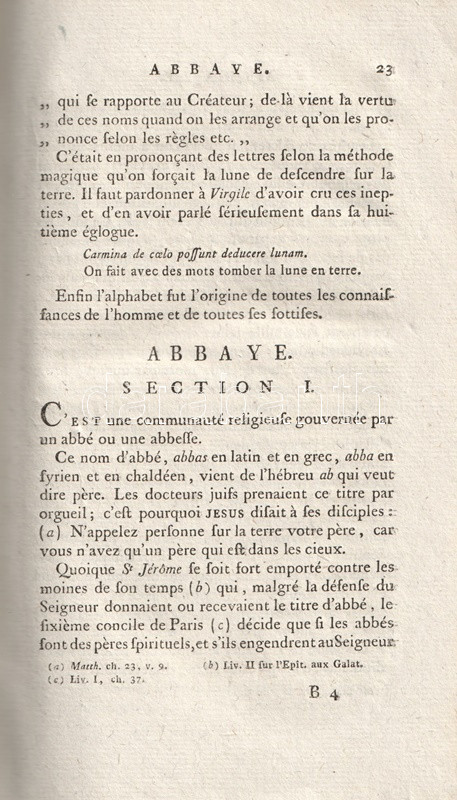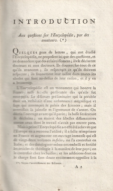 Kötetünk a Voltaire (1694-1778) valamennyi írását közreadni kívánó első, monumentális, 91 kötetes életműsorozat része. A felvilágosodás kulcsszerzőjének teljes életműkiadása csakis a szerző halála után, Franciaország határain túl, a francia cenzúrahatóságok nyomásától mentes vidékeken, túlnyomórészt a Baden-Badeni Őrgrófság határerődjében, kisebb részben a Német-Római Császárság más területein jelenhetett meg. Voltaire Filozófiai szótárának kötetei Gothában láttak napvilágot, Charles-Guillaume Ettinger emigráns nyomdász kiadásában. Az antiklerikális és tekintélyellenes filozófiai szótár első kötete az abc fogalmától a halálbüntetés fogalmáig jut el (arrets de mort), az abbé, Ábrahám, akadémia, alkimista, amazon, Amerika, anatómia, anglikán, Apokalipszis, apostol, Ararát és arianizmus fogalmait alaposan kitárgyalva. A Filozófiai szótár hét kötetben teljes.