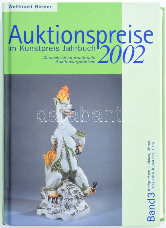 Auktionspreise im Kunstpreis Jahrbuch 2002. Deutsche & Internationale Auktionsergebnisse. Band 3: Antiquitäten, Judaica,m Uhren, Ostasiatica, Kunst des Islam. München, 2002, Weltkunst - Hirmer, 794+6 p. Német nyelven. Fekete-fehér fotókkal illusztrált. Kiadói kartonált papíkrötés.