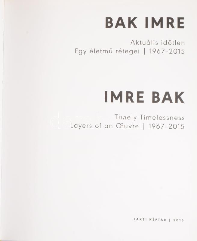 Bak Imre: Aktuális idÅ‘tlen. Egy életmű rétegei. 1967-2015. / Timely Timelessness. Layers of an Oevure. 1967-2015. Szerk. / Edited by Fehér, Dávid. Paks, 2016, Paksi Képtár, 235+1 p. Gazdag képanyaggal illusztrált. Magyar és angol nyelven. Kiadói egészvászon-kötés, kissé foltos borÃtóval,de belül jó állapotban.