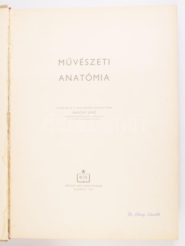 Barcsay JenÅ‘: Művészeti anatómia. Rajzolta és a magyarázó szöveget Ãrta: - - . Bp., 1953, Művelt Nép. ElsÅ‘ kiadás. Fekete-fehér képekkel gazdagon illusztrálva. Kiadói egészvászon-kötés, tulajdonosi névbélyegzÅ‘vel. Megjelent 3000 példányban.