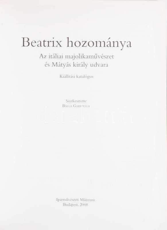 Beatrix hozománya. Az itáliai majolikaművészet és Mátyás király udvara. Szerk.: Balla Gabriella. Bp.,2008, Iparművészeti Múzeum, 183 p. Gazdag képanyaggal illusztrált. Kiadói papÃrkötés.