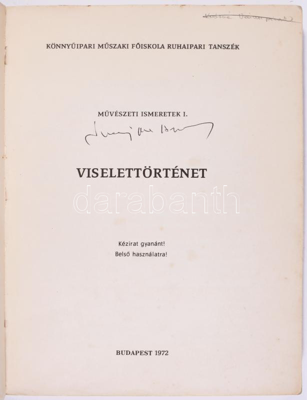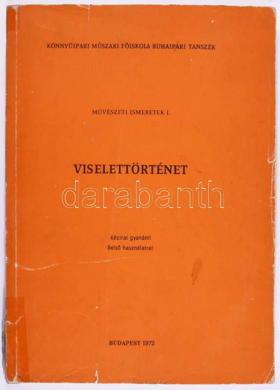 Deákfalvi Sarolta: Viselettörténet. Művészeti Ismeretek I. Összeáll.: - -. Bp., 1972., Könnyűipari Műszaki Főiskolai Ruhaipari Tanszék, 279 p. Fekete-fehér képanyaggal illusztrált. Megjelent 350 példányban. Kiadói papírkötés, sérült gerinccel, kopott, szakadt borítóval, ceruzás aláhúzásokkal és bejelölésekkel.