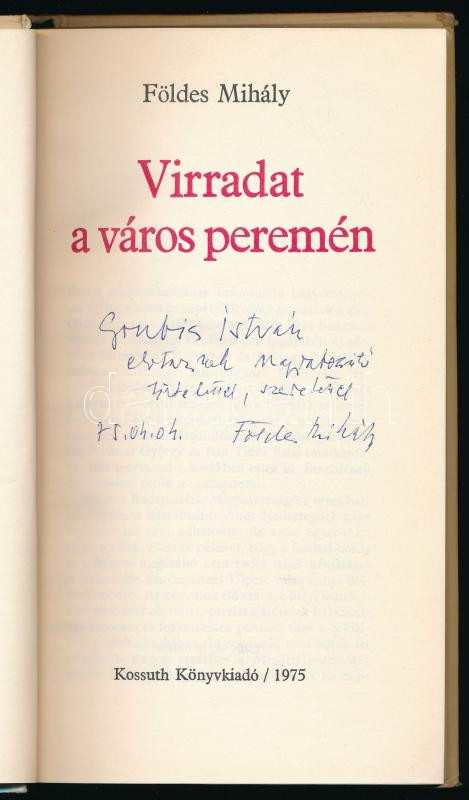 Földes Mihály: Virradat a város peremén. A szerző, Földes Mihály (1905-1984) József Attila-díjas író, újságíró, országgyűlési képviselő által Grubics István (1926-) kommunista politikus, XI. kerületi tanácselnök részére dedikált példány! Bp., 1975, Kossuth, 347+[3] p. Első kiadás. Kiadói egészvászon-kötés, kissé viseltes kiadói papír védőborítóban.
