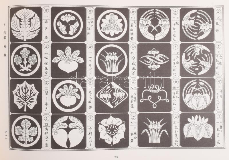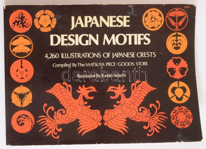 Japanese Design Motifs. 4,260 Illustrations of Japanese Crests. Compiled by The Matsuya Piece-Goods Store. Translated by Fumie Adachi. New York,(1972.,Dover, 216+6 p. Fekete-fehér képanyaggal illusztrált. Angol nyelven. Kiadói haránt-alakú papírkötés, kopott borítóval.