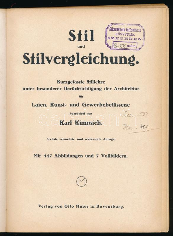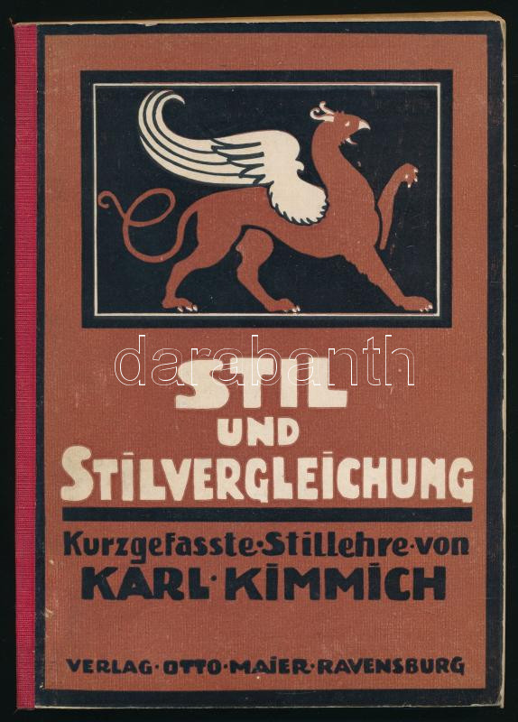 Kimmich, Karl: Stil und Stilvergleichung. Kurzgefasste Stillehre unter besonderer Berücksichtigung der Architektur für Laien, Kunst- und Gewerbebeflissene bearbeitet von - - . Ravensburg, é.n., Otto Maier. Fekete-fehér képekkel illusztrálva. Német nyelven. Kiadói félvászon-kötés