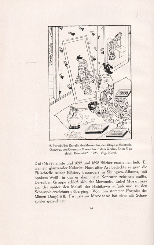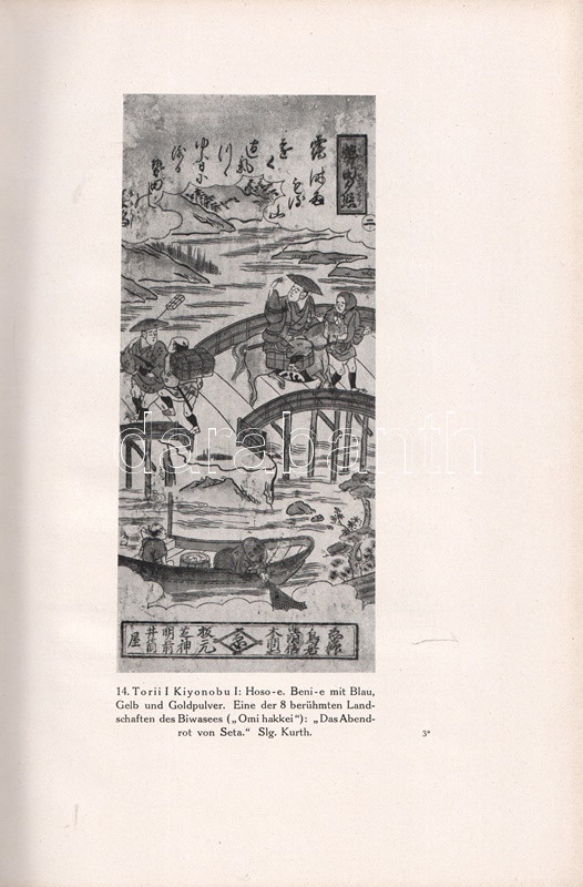 Julius Kurth (1870-1949) evangélikus lelkész, utazó, műgyűjtő. Több munkát publikált a kínai és japán fametszés történetéről. Gazdagon illusztrált monográfiája a japán fametszés évszázados technikáit tekinti át, oldalszámozáson belül három, kihajtható, művész-aláírásokat hordozó táblával. A mű első kiadása 1911-ben jelent meg, példányunk a harmadik, átdolgozott kiadásból való.