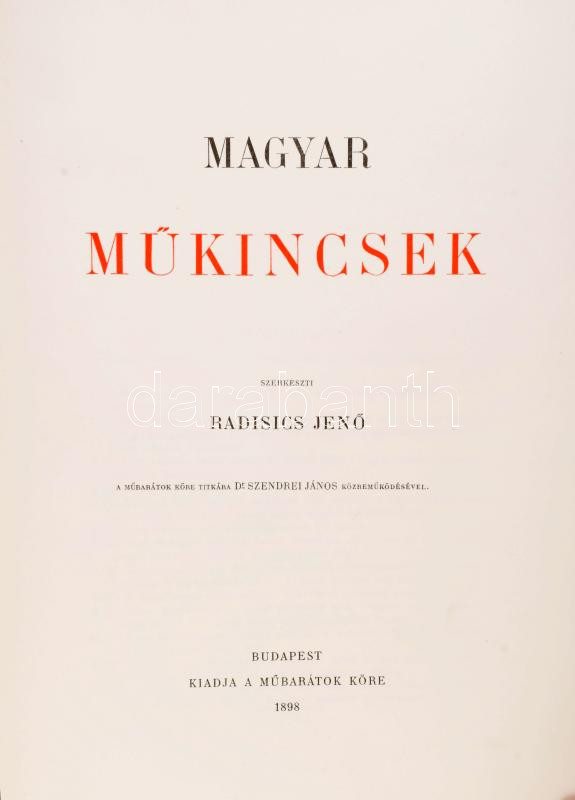 Radisics Jenő (szerk.): Magyar műkincsek. I-II. köt. [Egybekötve. Három kötetben teljes.] I.: Budapest. II.: A legfelsőbb uralkodóház magyar műkincsei. Bp., 1896-1898, Műbarátok Köre, XXVIII p.+ 9-126 p.; IX+[3]+158 p.; 35 (hártyapapírral védett, részben színes) t. Egyetlen kiadás. Átkötött félvászon-kötésben, nagyrészt jó állapotban, az I. kötetből az 1-8. oldalak hiányoznak, illetve a két kötetből összesen 6 képtábla hiányzik.