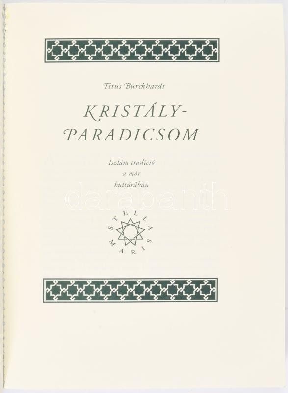 Titus Burckhardt: Kristályparadicsom. Iszlám tradíció a mór kultúrában. Ford.: Bódvai András. 1994, Stella Maris, 279+1 p. Kiadói papírkötés, kissé kopott bortóval.