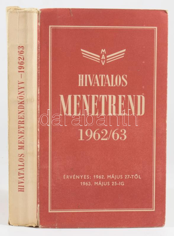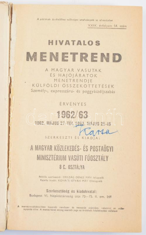 1962/63 Hivatalos menetrend. A magyar vasutak és hajójáratok menetrendje. Külföldi összeköttetések. Személy-, expresszáru- és poggyászdíjszabás. Szerk. és kiadja: a Magyar Közlekedés- és Postaügyi Minisztérium vasúti főosztály 8 C. osztálya. Bp., 1962, Athenaeum-ny., 714+[6] p. Kiadói papírkötés.