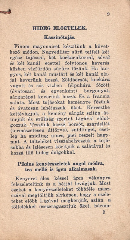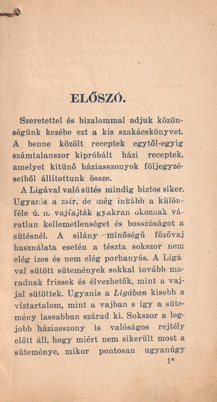 Felül nemzeti színű zsinórral fűzött kiadványunk a magyar piacon 1930 körül megjelenő új termékkel, a Liga margarinnal készíthető ételreceptek gyűjteménye.