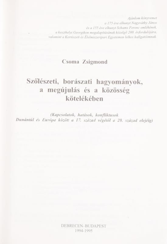 Csoma Zsigmond: Szőlészeti, borászati hagyományok, a megújulás és közösség kötelékében. (Kapcsolatok, hatások, konfliktusok Dunántúl és Európa között a 17. század végétől a 20. század elejéig.) Centrál-Európa Alapítványi Könyvek 3. Debrecen-Bp., 1994-1995, Centrál-Európa Alapítvány, 487 p. Egyetlen kiadás. Kiadói papírkötés.