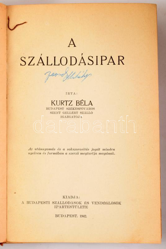 Kurtz Béla: A szállodásipar. Budapest, 1942. A Budapesti Szállodások és Vendéglősök Ipartestülete (Merkantil-nyomda). [2] + 273 + [1] p. + 9 melléklet (3 kihajtható: két kétoldalas költségszámítási táblázat, egy hasonmás; 6 kétoldalas). Egyetlen kiadás. Teljességre törekvő kézikönyv a szállodairányítás kérdéseiről, mely a szálloda építészeti, belsőépítészeti, hangszigetelési, bútorozási, műszaki, karbantartási, takarítási és higiénés kihívásaitól a személyzet feladatainak tárgyalásán át a marketing és könyvelés problémáiig szerteágazó témákban ad tanácsot a reménybeli szállodavezetők számára; a kötet kitér a nyugati és a hazai gyakorlat különbségeire, illetve - háborús év lévén - légoltalmi kérdésekre is. A szerző a Gellért Szálló igazgatója. Kiadói kopottas félvászon kötésben, a fűzésnél elváltak a lapok, de mind jó állapotban, könnyen javítható