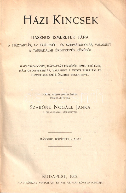 Szabóné Nogáll Janka (összeáll.): Házi kincsek. Hasznos ismeretek tára a háztartás, az egészség- és szépségápolás, valamint a társadalmi érintkezés körébÅ‘l. Szakácskönyvvel, háztartási eszközök ismertetésével, házi gyógyszertár, valamint a vegyi tisztÃtás és kozmetikus szépÃtÅ‘szerek receptjeivel. Fiatal asszonyok számára.