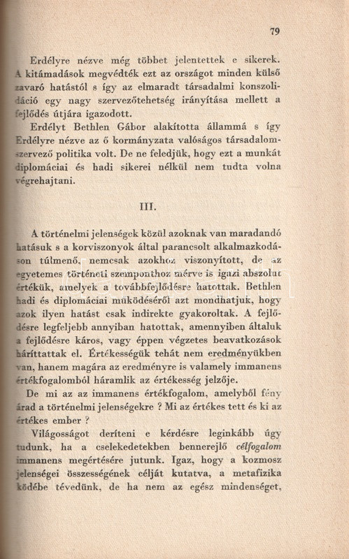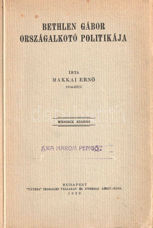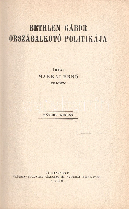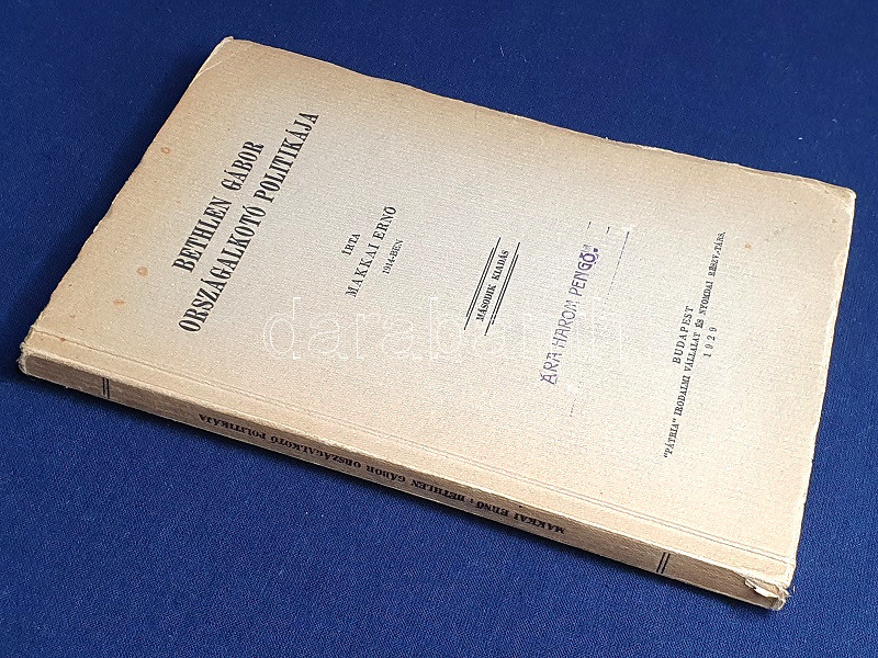 Makkai Ernő (1882-1923) történész, református lelkész, a kolozsvári Református Kollégium tanára, főként Erdély történetével foglalkozott. "Bethlen Gábor országalkotó politikája" című értekezése demográfiatörténeti bevezetés után a fejedelem kül- és belpolitikáját vizsgálja. Az 1914-ben készült értekezés, bár elsősorban a bethleni építőmunkát elemzi, számos meglepő adattal szolgál az erdélyi szászok és oláhok történetével kapcsolatban. Példányunk a mű második kiadásából való.