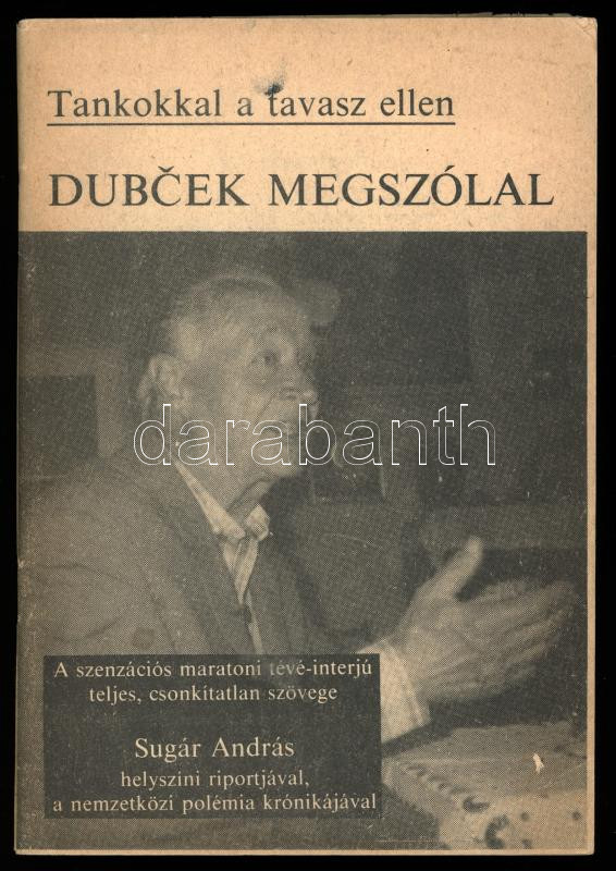 Sugár András: Tankokkal a tavasz ellen. Dubček megszólal. A szenzációs maratoni tévé-interjú teljes, csonkítatlan szövege Sugár András helyszíni riportjával, a nemzetközi polémia krónikájával. [Bp.], 1989, szerző, 95+[1] p. Kiadói tűzött papírkötés.
