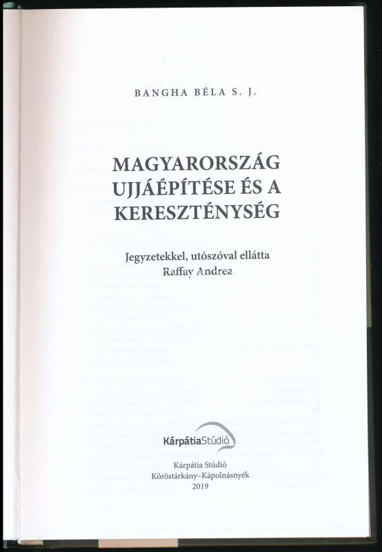 Bangha Béla S. J.: Magyarország újjáépítése és a kereszténység. Köröstárkány-Kápolnásnyék, 2019, Kárpátia Stúdió. 222p. Kiadói kartonált kötés, jó állapotban.