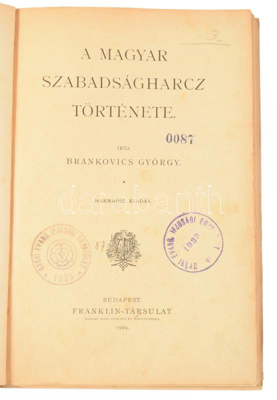 Brankovics György: A magyar szabadságharcz története. Bp., 1909, Franklin, 416 p.+3 t. 3. kiadás. Szövegközti fekete-fehér illusztrációkkal. Átkötött félvászon-kötésben, kopott, foltos borítóval, laza fűzéssel, egy kijáró lappal, ceruzás aláhúzásokkal és a tartalomjegyzéknél ceruzás bejegyzésekkel, jegyzetekkel.