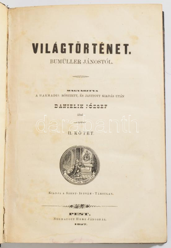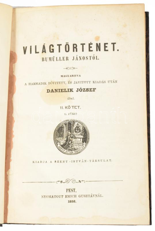 [Bumüller, Johannes (1811-1890)] Bumüller János: Világtörténet. II. köt. I-II. füzet. (2 kötetben.) Ford.: Danielik József. Pest, 1857-1858, Szent-István-Társulat, [2]+467 p.; [4]+372 p. Átkötött félvászon-kötésben, helyenként kissé foltos lapokkal.