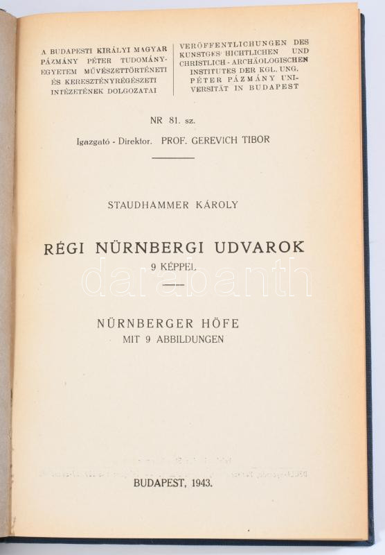 Staudhammer Károly: Régi nürnbergi udvarok. A Budapesti Királyi Magyar Pázmány Péter Tudományegyetem Művészettörténeti és Keresztényrégészeti Intézetének Dolgozatai 81. sz. Bp., 1943, Budapesti Királyi Magyar Pázmány Péter Tudományegyetem Művészettörténeti és Keresztényrégészeti Intézete, 96 p.+5 t. Átkötött egészvászon kötésben.