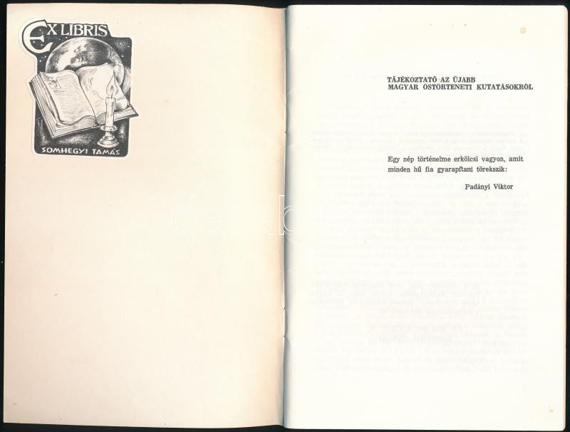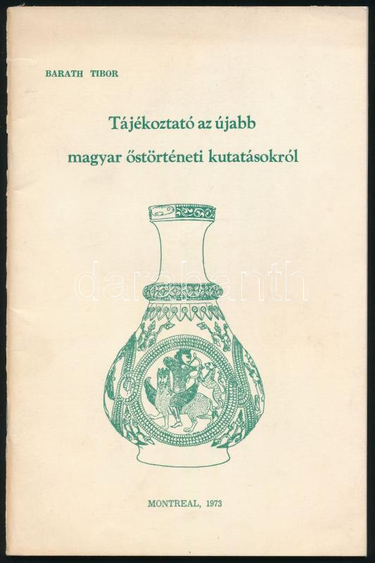Baráth Tibor: Tájékoztató az újabb magyar őstörténeti kutatásokról. Montreal, 1973, szerző, 55 p. Első, emigráns kiadás. Kiadói tűzött papírkötés, ex libris-szel.