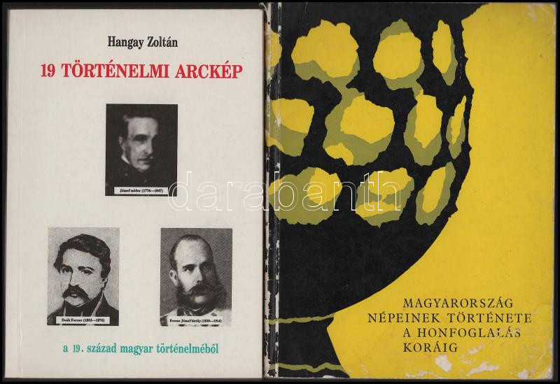 Hangay Zoltán: 19 történelmi arckép a 19. század magyar történelméből. Bp., 1991, Trezor. Kiadói papírkötés, a szövegben aláhúzásokkal. + Vezető a Magyarország népeinek története a honfoglalás koráig című kiállításhoz. Bp., 1962, Magyar Nemzeti Múzeum. Kiadói papírkötés, megviselt borítóval, helyenként lapszéli ázásnyomokkal.