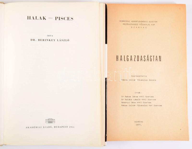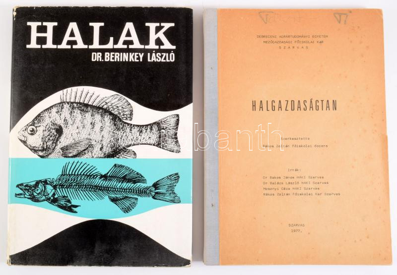 Rákos Zoltán: Halgazdaságtan. Szerk.: - -. Szarvas, 1977, Debreceni Agrártudományi Egyetem Mezőgazdasági Főiskolai Kar, 220 p. Megjelent 225 példányban. Kiadói félvászon-kötés, foltos, szakadt elülső borítóval. + Berinkey László: Halak. Bp.,1966, Akadémiai, 2+138+1 p. Megjelent 500 példányban. Kiadói egészvászon-kötés, kiadói papír védőborítóban.