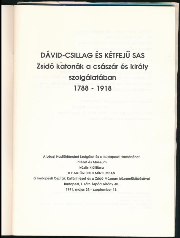 Dávid-csillag és kétfejű sas. Zsidó katonák a császár és király szolgálatában 1788-1918. (KiállÃtási katalógus.) Bécs-Bp., 1991, Hadtörténelmi Szolgálat - Hadtörténeti Intézet és Múzeum, 61+[3] p. Fekete-fehér képekkel illusztrálva. Kiadói tűzött papÃrkötés.