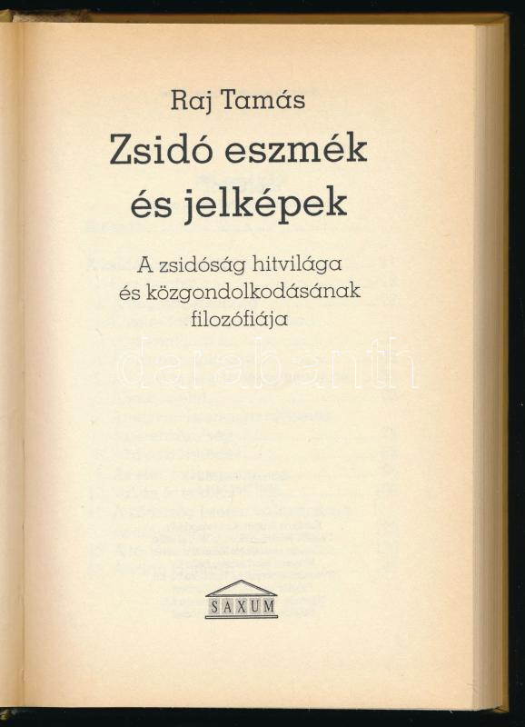 Raj Tamás: Zsidó eszmék és jelképek. A zsidóság hitvilága és közgondolkodásának filozófiája. Az égre néző ember. [Bp.], 2002, Saxum, 246+[2] p. Kiadói kartonált papírkötés.
