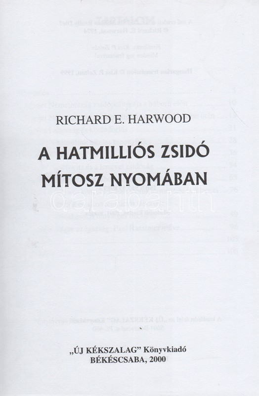 Richard E. Harwood: A hatmilliós zsidó mÃtosz nyomában. (FordÃtotta: Kiss P. Zoltán.) Békéscsaba, (2001). ,,Új Kékszalag'' Könyvkiadó. 119 + [1] p. ,,A ,,Holocaust''-ról alkotott alternatÃv vélemény kinyilvánÃtása egyes európai országokban bűncselekménynek minÅ‘sül. Vajon miért nem engedik e témát a másik oldalról is megvilágÃtani? Azért, mert a ,,Holocaust'' hitelességét semmilyen valóságos történelmi tény nem támasztja alá. A cáfolat viszont könnyen bizonyÃtható, mint az ebbÅ‘l a könyvbÅ‘l is kiderül, ha az Olvasó az elejétÅ‘l a végéig figyelmesen elolvassa. A cionisták minden országban, ahol csak tehették, betiltatták ezt a művet. Ez a tény már önmagában is a fentebb emlÃtetteket bizonyÃtja.'' Példányunk utolsó Ãve fordÃtva bekötve. Fűzve, szÃnes kiadói borÃtóban, szép példány.