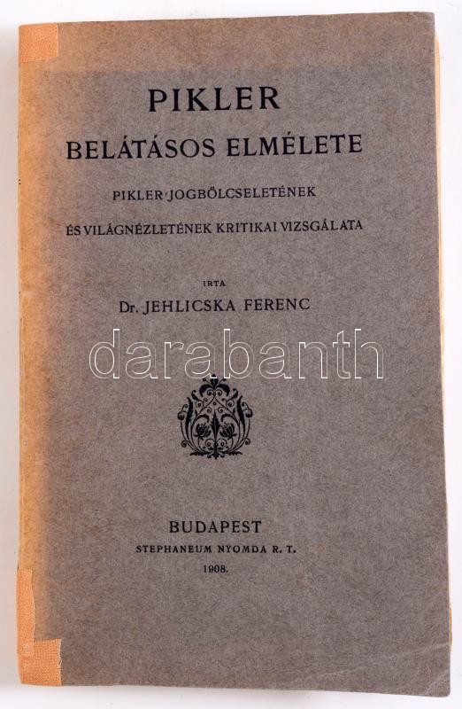Dr. Jehlicska Ferenc: Pikler belátásos elmélete. Pikler jogbölcseletének kritikai vizsgálata. Bp., 1908, Stephaneum. 308p. Papírkötésben, kopottas állapotban.