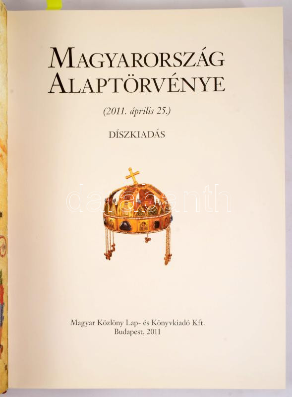 Magyarország alaptörvénye. (2011. április 25.) Díszkiadás. Bp., 2011, Magyar Közlöny, 215+[1] p. Kiadói kartonált papírkötés. Számozott (787./1000) példány.