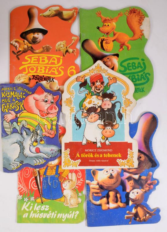 6 db képes mesekönyv: Móricz Zsigmond: Kismalac meg a farkasok.; A török és a tehenek.; Ki lesz a húsvéti nyúl?; Sebaj Tóbiás történetek 1., 3., 6. számok. Kiadói tűzött papírkötés, vegyes állapotban.