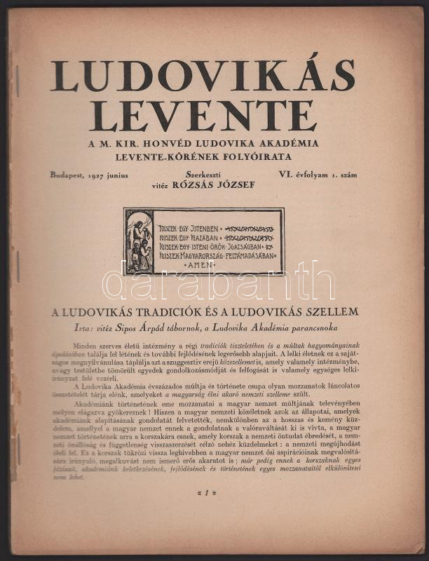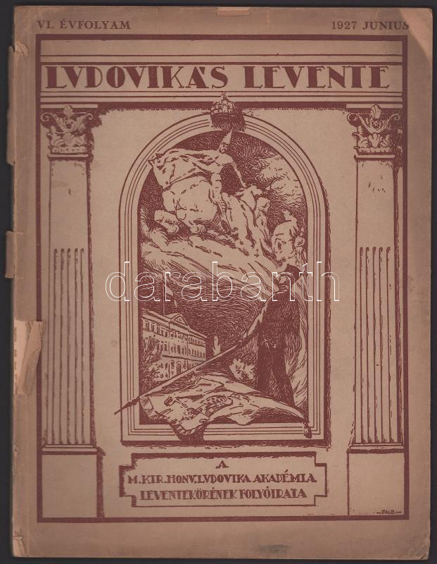 1927 Ludovikás Levente, a M. Kir. Honvéd Ludovika Akadémia Leventekörének folyóirata, VI. évf. 1. szám, 1927. június. Szerk.: vitéz Rózsás József. Bp., Wodianer F. és Fiai-ny., 64 p.+ 8 (színes) t.+ 2 t. Szövegközti és egészoldalas, fekete-fehér és színes képekkel, hirdetésekkel. Kiadói papírkötés, sérült, különvált elülső borítóval, a hátsó borító hiányzik.