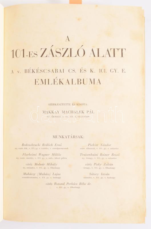 Makkay Machalek Pál: A 101-es zászló alatt. A v. békéscsabai cs. és k. 101. gy. e. emlékalbuma. Szerk. és kiadta: - - . Bp., 1934, Pless Gy. Közlekedési-ny., 452 p. Szövegközti fekete-fehér képekkel illusztrálva. Kiadói ezüstözött egészvászon-kötés, viseltes borÃtóval, helyenként foltos lapokkal, néhány sérült, javÃtott lappal, több lapon tollas firkákkal.