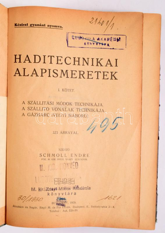 Schmoll Endre: Haditechnikai alapismeretek. I. köt. A szállítási módok technikája. A szállító vonalak technikája. A gázharc (vegyi háború). Bp., 1929, szerző (Ábrahám és Sugár-ny.), 503+[1] p. Egyetlen kiadás. Átkötött félvászon-kötésben, kissé viseltes borítóval, intézményi bélyegzőkkel. Ritka!
