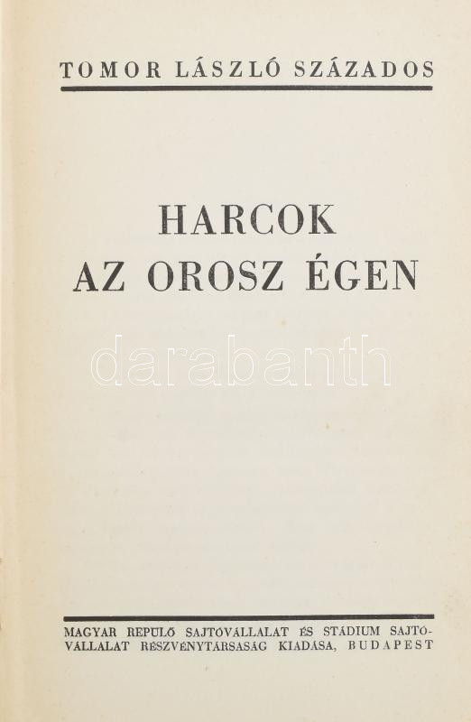Tomor László: Harcok az orosz égen. A repülő ember I. köt. Bp.,[1942], Magyar Repülő Sajtóvállalat-Stádium, 162 p.+8 (fekete-fehér képtáblával) t. Kiadói félvászon-kötés, kissé kopott borítóval,.kis gerinc sérüléssel Betiltott! Szerepel az Ideiglenes Nemzeti Kormány által 1945-ben betiltott fasiszta, és szovjetellenes könyvek jegyzékén! Kiadói félvászon-kötés,