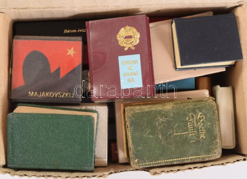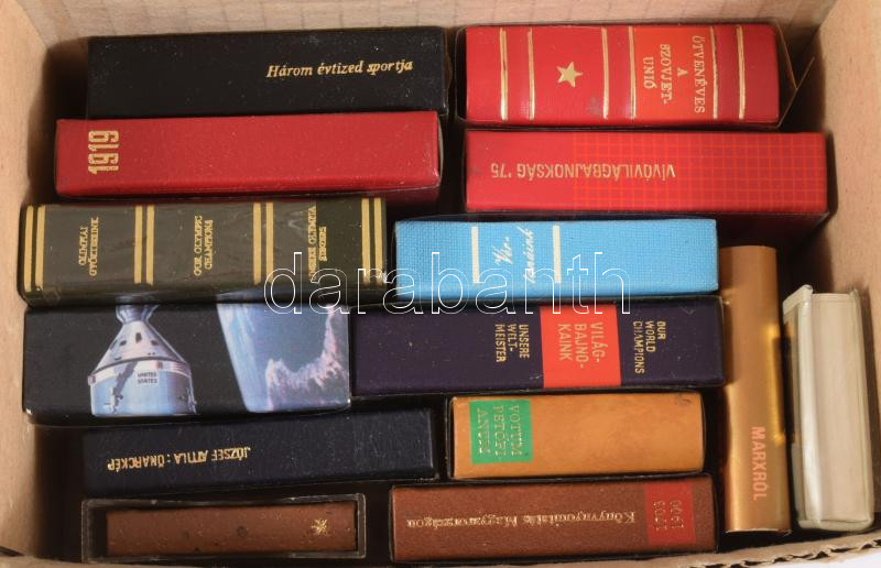 Kis doboznyi minikönyv, klf témákban, sport, kommunizmus, könyvnyomtatás, stb.
