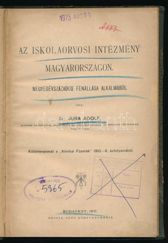 Juba Adolf: Az iskolaorvosi intézmény Magyarországon. Negyedévszázados fennállása alkalmából írta: - - . A szerző, Juba Adolf (1864-1928) orvos, iskolaorvos, egyetemi tanár, az iskola-egészségügy egyik neves úttörője által dedikált példány! (,,Nagyságos Éltes József [...] urnak tisztelete jeléül a szerző".) Különlenyomat a ,,Klinikai Füzetek" 1910-II. évfolyamából. Bp., 1911, Brózsa Ottó-ny., 98+[2] p. Átkötött félvászon-kötésben, az eredeti papírborítót bekötötték, néhány lap kissé sérült, intézményi bélyegzőkkel.