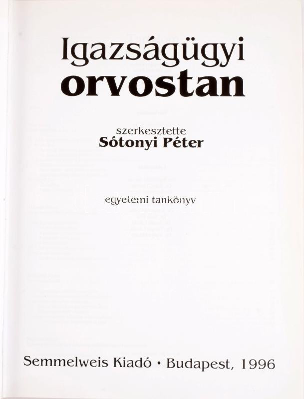 Sótonyi Péter: Igazságügyi orvostan. Bp., 1996, Semmelweis. 374p. Kiadói kartonált kötés, filces kiemelésekkel, egyébként jó állapotban.