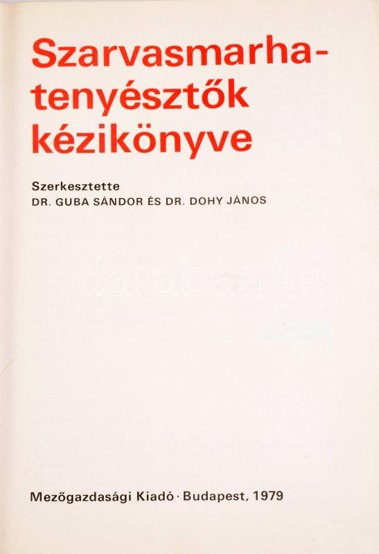 Szarvasmarha-tenyésztők kézikönyve. Szerk.: Guba Sándor és Dohy János. Bp., 1979, Mezőgazdasági Könyvkiadó, 654+8 p. Kiadói egészvászon-kötés, kiadói papír védőborítóban, kissé foltos lapélekkel, a tartalomjegyzékben bejelölésekkel.