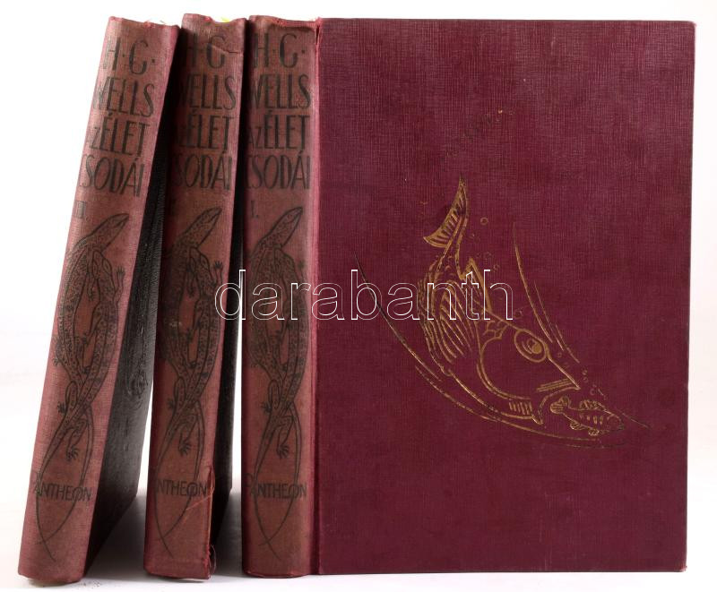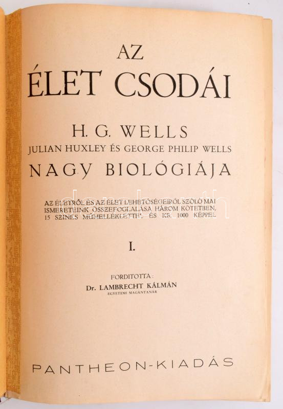 Wells, [Herbert George] - Huxley, Julian - Wells, George Philip: Az élet csodái. I-III. köt. Ford.: Lambrecht Kálmán. [Bp., 1930], Pantheon, 1050+[2] p.+ 15 t. Szövegközti és egészoldalas, fekete-fehér és színes illusztrációkkal. Kiadói egészvászon-kötés, a II. kötet gerince sérült, az I-II. kötetekben javításokkal, ex libris-szel.