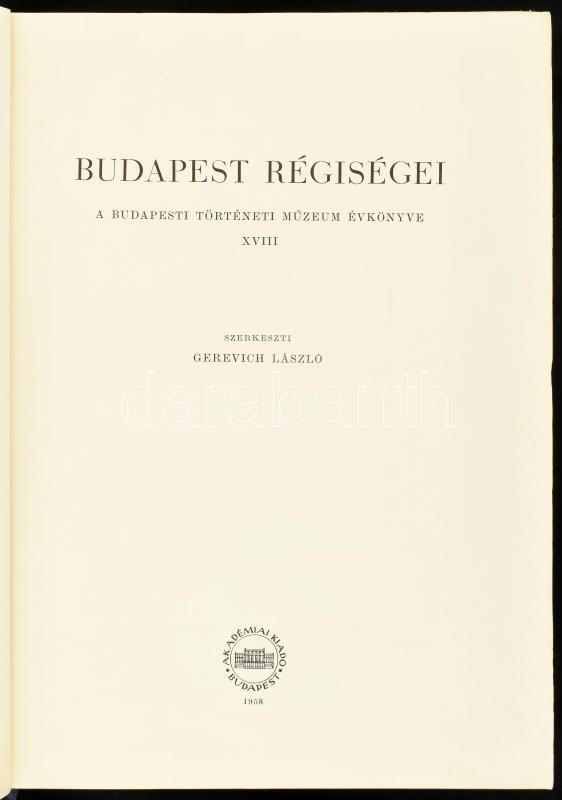 Gerevich László: Budapest régiségei. Bp., 1958. Akadémiai Kiadó. Kiadói kopottas egészvászon-kötés, sérült gerinccel, kopott, foltos borítóval, laza, kissé sérült kötéssel.