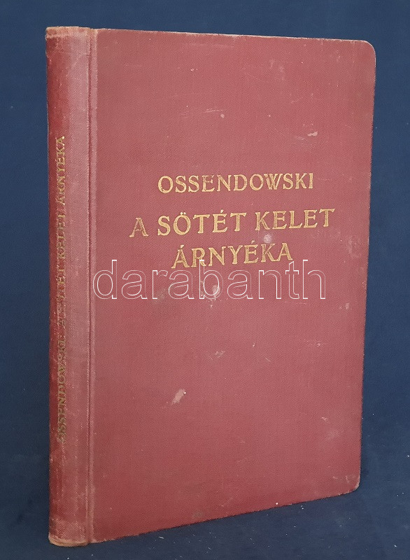 Ossendowski, [Ferdynand Antoni]: A sötét kelet árnyéka. The Shadow of the Gloomy East. Fordította: Balassa József. Budapest, [1925]. Franklin-Társulat (ny.) 143 + [1] p. Első magyar kiadás. Ferdynand Ossendowski (1876-1945) lengyel geológus, antropológus, földrajzi író, Oroszország-szakértő szentpétervári tanulmányok után jelentős utazásokat tett Oroszország-szerte, az 1905-ös forradalmi mozgalmak idején börtönbüntetést, majd szibériai száműzést is szenvedett, az oroszországi polgárháborúban pedig Kolcsak admirális tanácsadója volt. A bolsevik fordulat vehemens kritikusa ebben a művében saját korábbi néprajzi tapasztalatai alapján kísérletet tesz a modernség előtti állapotban élő, könnyen kihasználható orosz néplélek feltárására, melyet a cári és a bolsevik rendszer, illetve mindkét rendszer ügyeskedői kíméletlenül kihasználnak. A bolsevik rendszerről is erős kritikát megfogalmazó kötet szerepel az Ideiglenes Nemzeti Kormány által 1945-ben betiltott könyvek listáján. (Modern utazók, felfedezők könyvtára.) Aranyozott, enyhén kopott kiadói egészvászon kötésben. Jó példány.