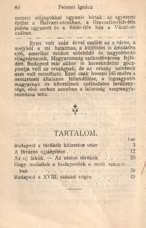 Peisner Ignác (1855-1934) újságÃró, helytörténész. Hazai és külföldi német nyelvű lapokba Ãrt tárcái mellett számos cikke született Budapest történetérÅ‘l. Rövid munkája a fÅ‘városnak a törökdúlás utáni másfél évszázadára (1686-1815) koncentrál.