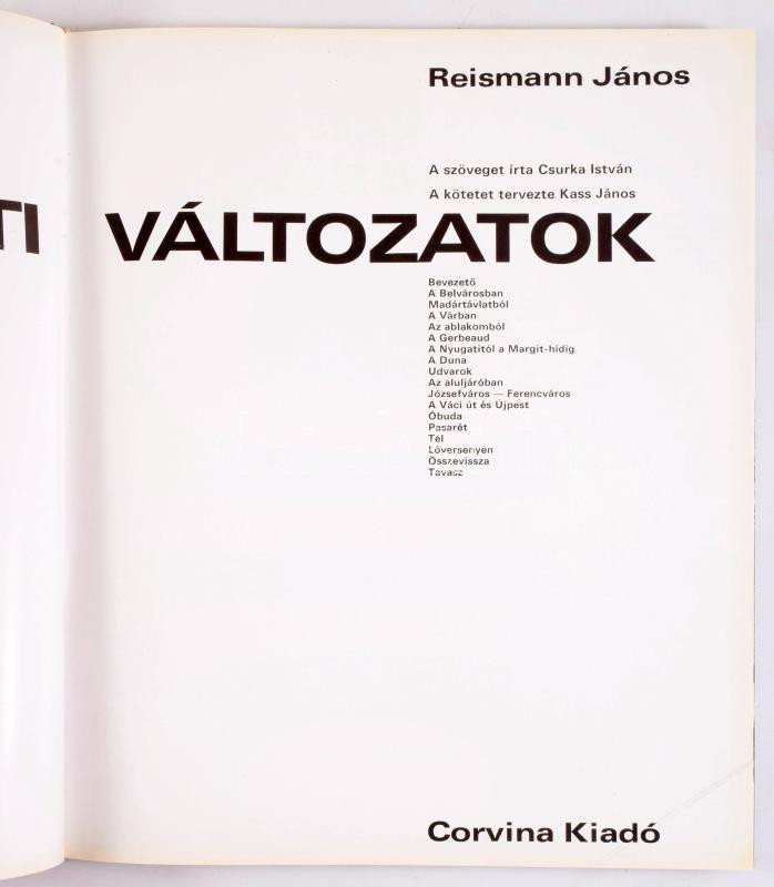 Reismann János: Budapesti változtatok. A szöveget írta: Csurka István. A kötetet tervezte: Kass János. 1971, Corvina. Kiadói műbőr kötés, sok képpel, jó állapotban.